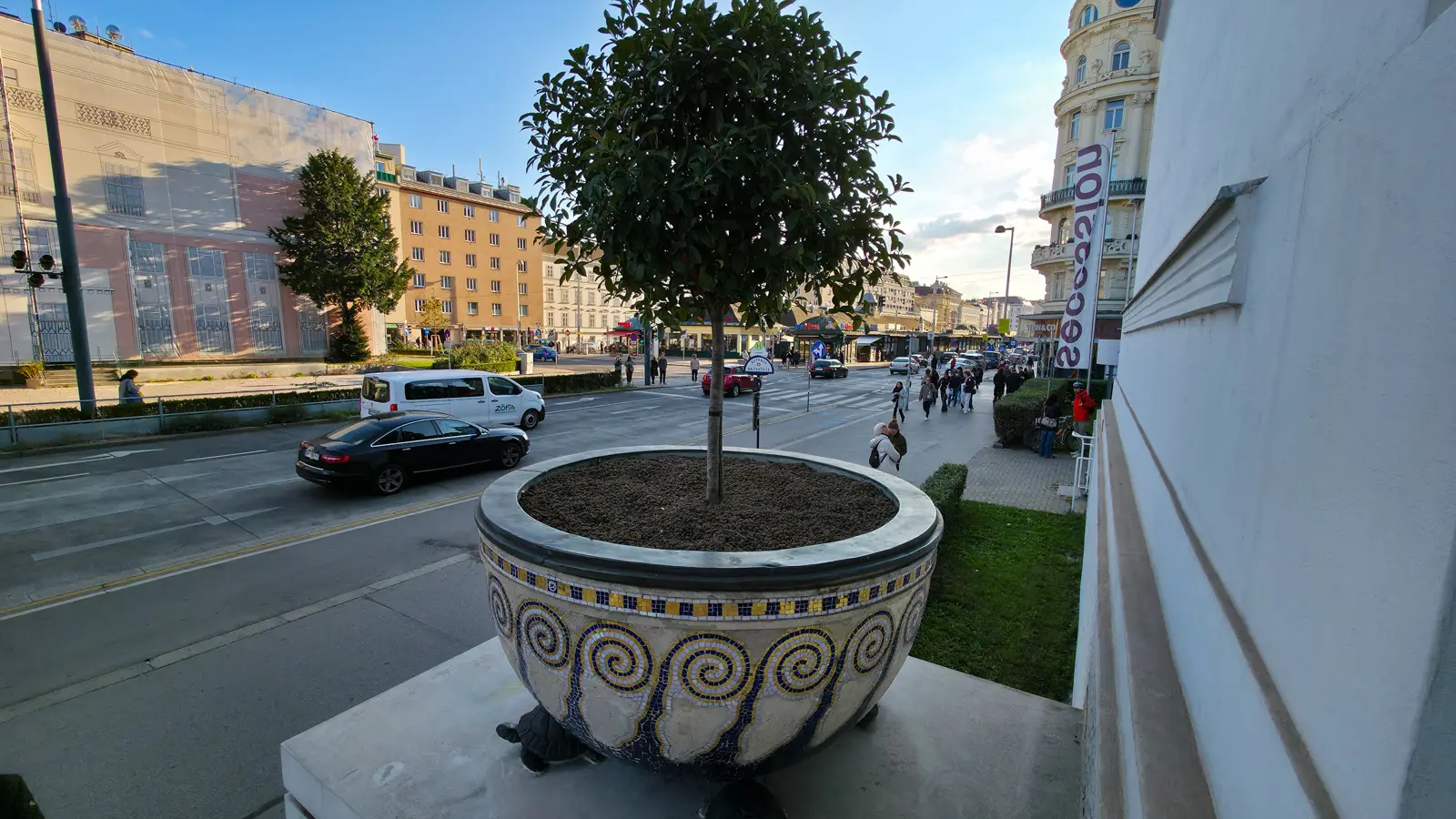 Above the entrance, the sculptural group of three Gorgons quietly holds its place – representing painting, sculpture, and architecture – a symbolic reminder of the unity of artistic disciplines at the heart of the Secession movement. On either side, elegant ornamental planters anchor the composition, adding balance and a touch of softness to the otherwise structured façade. Golden accents frame the entrance, catching the light just enough to draw your attention without overwhelming the overall simplicity.