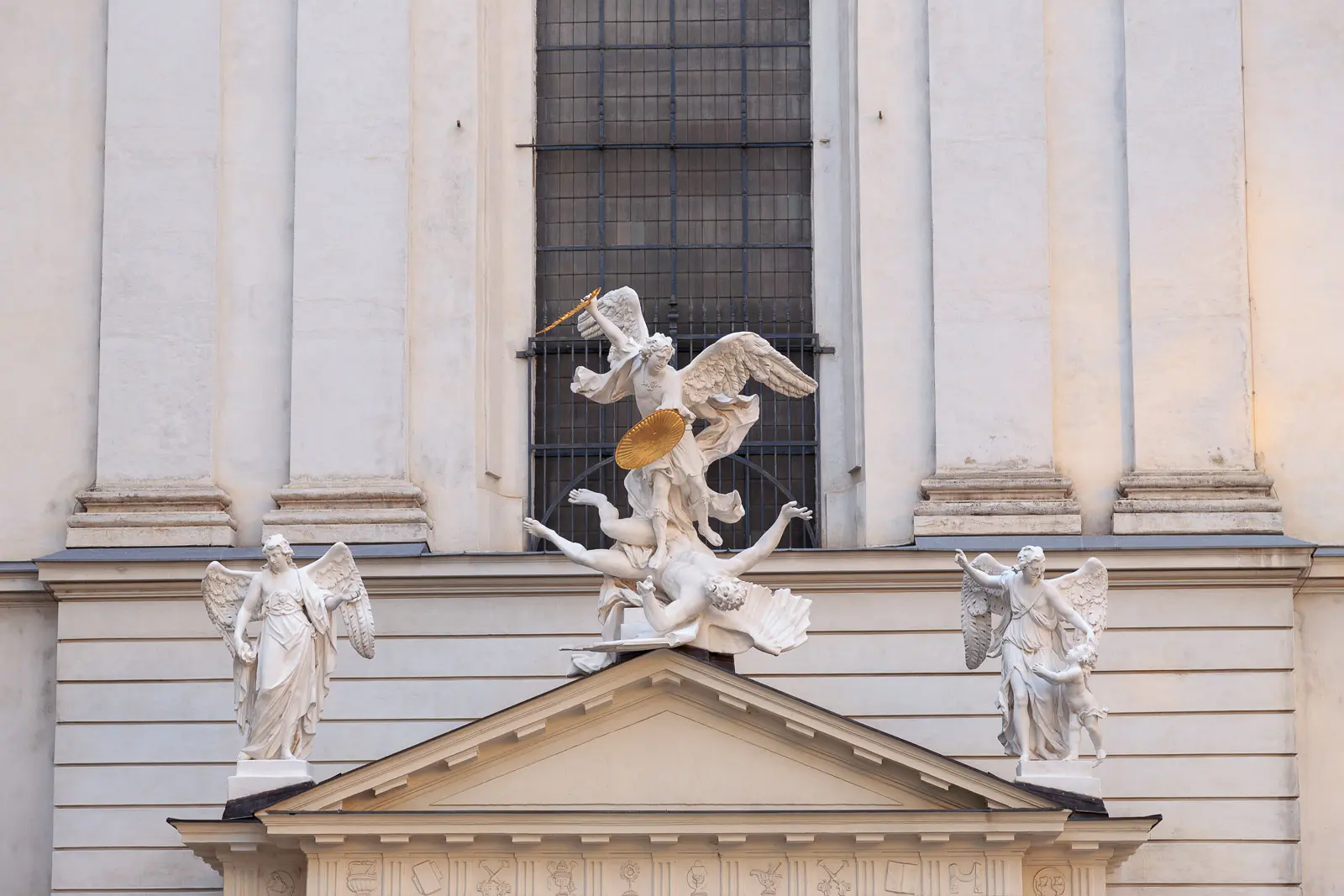 Compared with the monumental scale of the nearby Hofburg, St. Michael’s exterior feels almost restrained – yet that contrast is precisely what makes it compelling. The church has Romanesque and Gothic origins, but the façade visitors see today was rebuilt in 1792 in a Neoclassical style, creating a structure that feels grounded and enduring rather than theatrical. Above the entrance, resting on Doric columns designed by Antonio Beduzzi, a dramatic sculptural group crowns the pediment: winged angels surrounding St. Michael slaying Lucifer, created in 1725 by the Italian sculptor Lorenzo Mattielli. The composition adds movement and symbolism to an otherwise restrained façade, reminding visitors of the church’s spiritual purpose even within an increasingly imperial setting. Mattielli’s work also connects the church visually to the nearby Hofburg, where he sculpted the famous Hercules figures at the palace entrance just across the square.