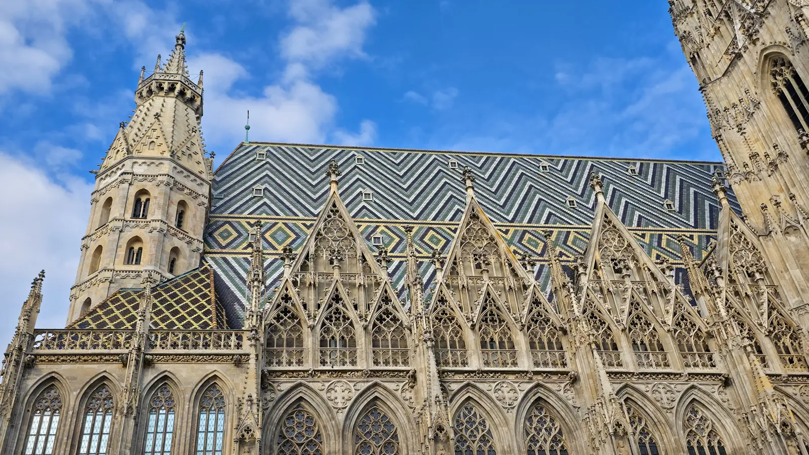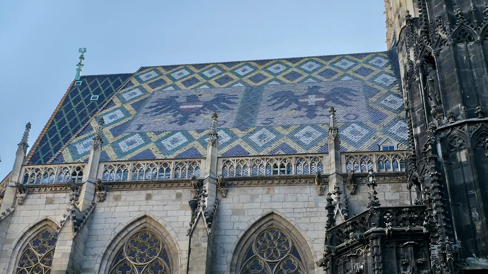 One of the most distinctive features of St. Stephen’s Cathedral is its extraordinary roof. Covered in approximately 230,000 glazed tiles in shades of white, yellow, green, and brown, the steeply sloping surface forms vibrant geometric patterns that shimmer in the changing light. These colorful tiles create large heraldic designs that reflect Austria’s imperial history. On the northern side of the roof appears the magnificent double-headed eagle of the Habsburg Empire, while the southern side displays the coats of arms of the city of Vienna and the Republic of Austria. Seen from nearby rooftops or from the cathedral towers, the roof becomes a vast mosaic that transforms the building into a monumental work of art.