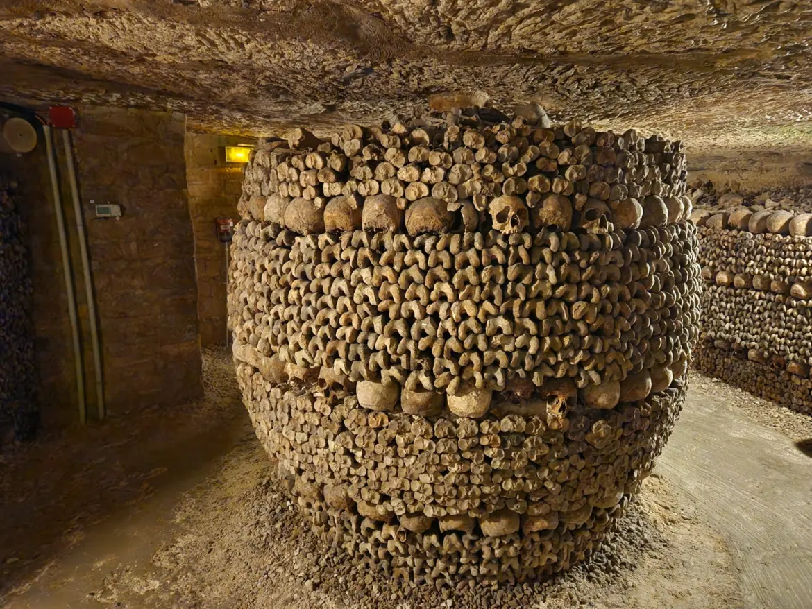 In the 18th century, Paris faced overflowing cemeteries, leading to unsanitary conditions. In response, authorities began relocating remains to former limestone quarries beneath the city, creating the Catacombs. Opened to the public in 1809, the catacombs became a place where art and reverence for the dead meet. Bones are carefully arranged, with skulls and femurs forming patterns along the walls, creating a hauntingly beautiful, respectful display.