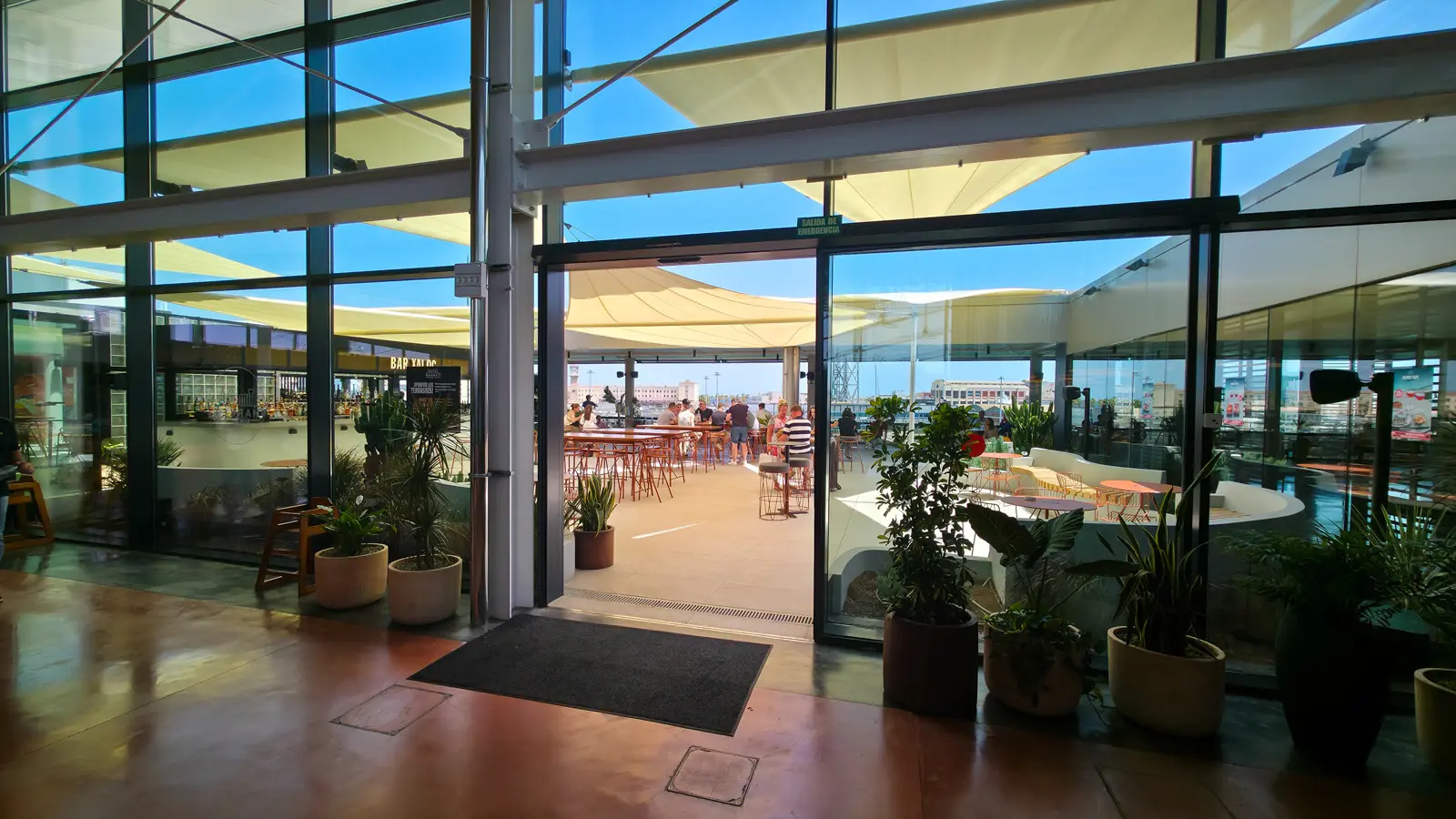 Inside, the space hums with life. Ten open kitchens wrap around a central seating area with long wooden tables, surrounded by four stylish bars, a full-service restaurant, and a studio and stage area for cultural events. The design mixes industrial modernity and Catalan warmth. Polished concrete, wood, and glass blending seamlessly with the sunlight and sea breeze that filter through the open terraces.